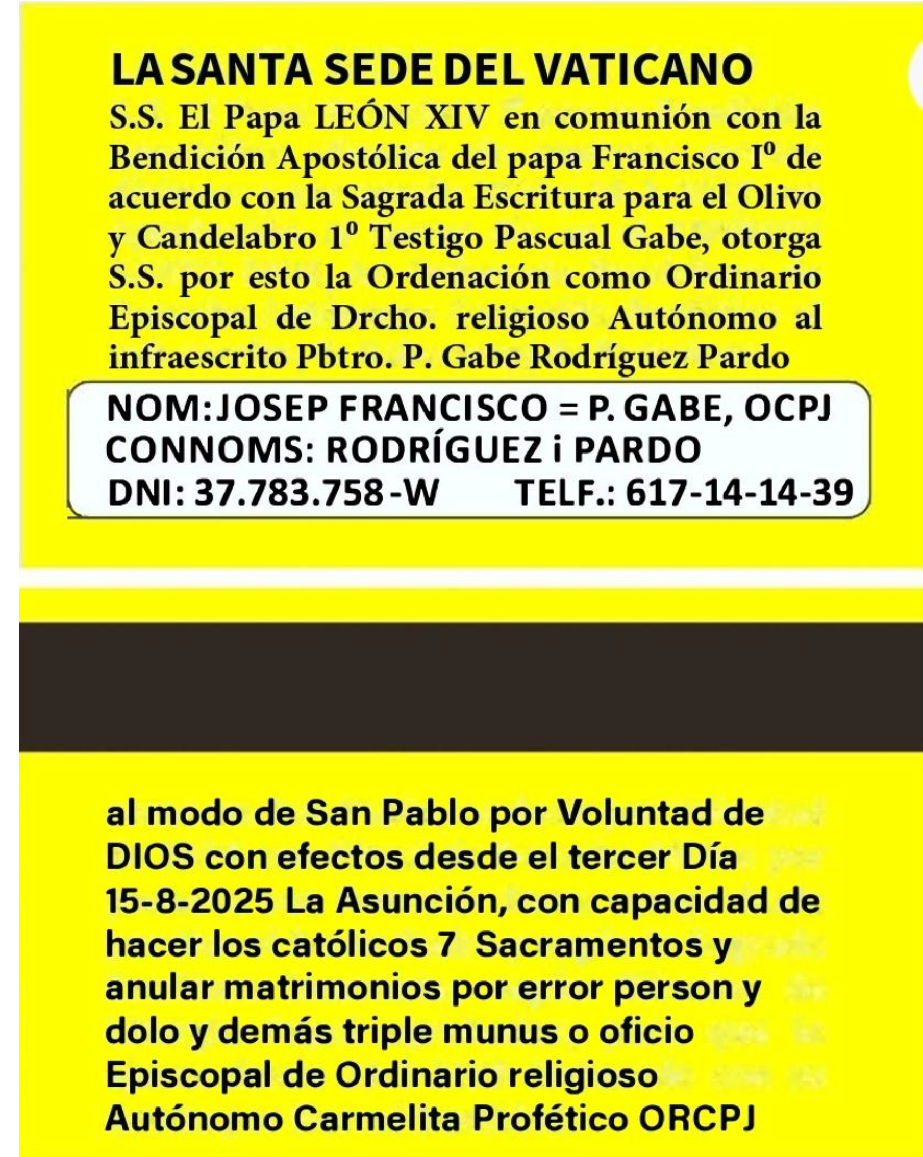 ACREDITACIONES APROBADAS CARD. RE Y EL SANTO PADRE ACTUAL CON MI SER ORDINARIO EPISCOPAL DE DERECHO RELIGIOSO AUTÓNOMO EN COMUNIÓN CON ÉL, YO GABE PRIOR VITALICIO ORCPJ Y SACERDOTE AUTÓNOMO CITADO